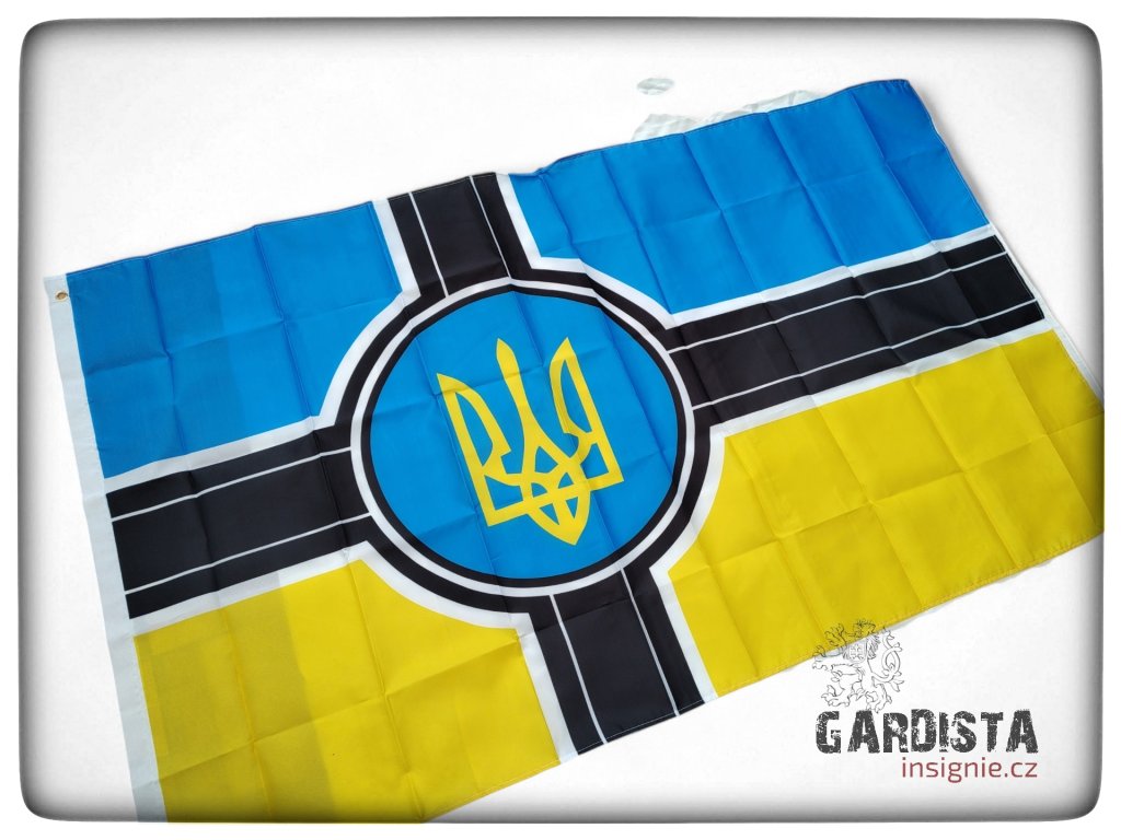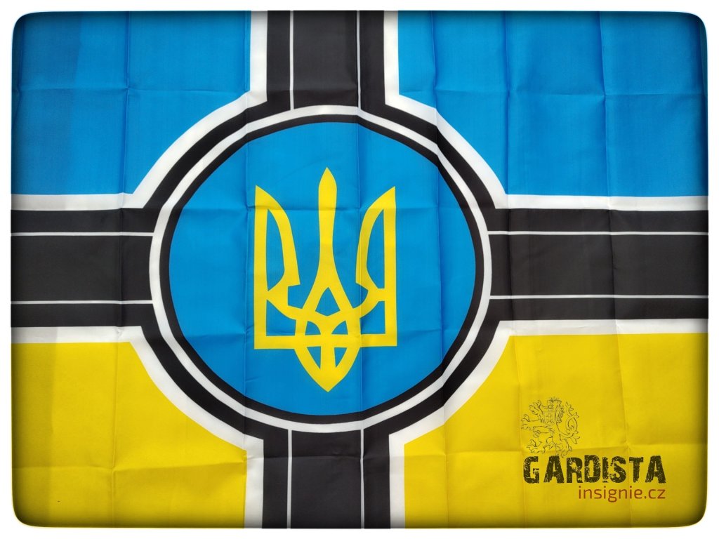 Stylizované provedení ukrajinské vlajky ve stylu dobrovolnických jednotek či jednotek bojových formací, vizuálně odkazující na evropskou bojovou heraldiku. Vlajka patří do kontextu současného konfliktu na Ukrajině.