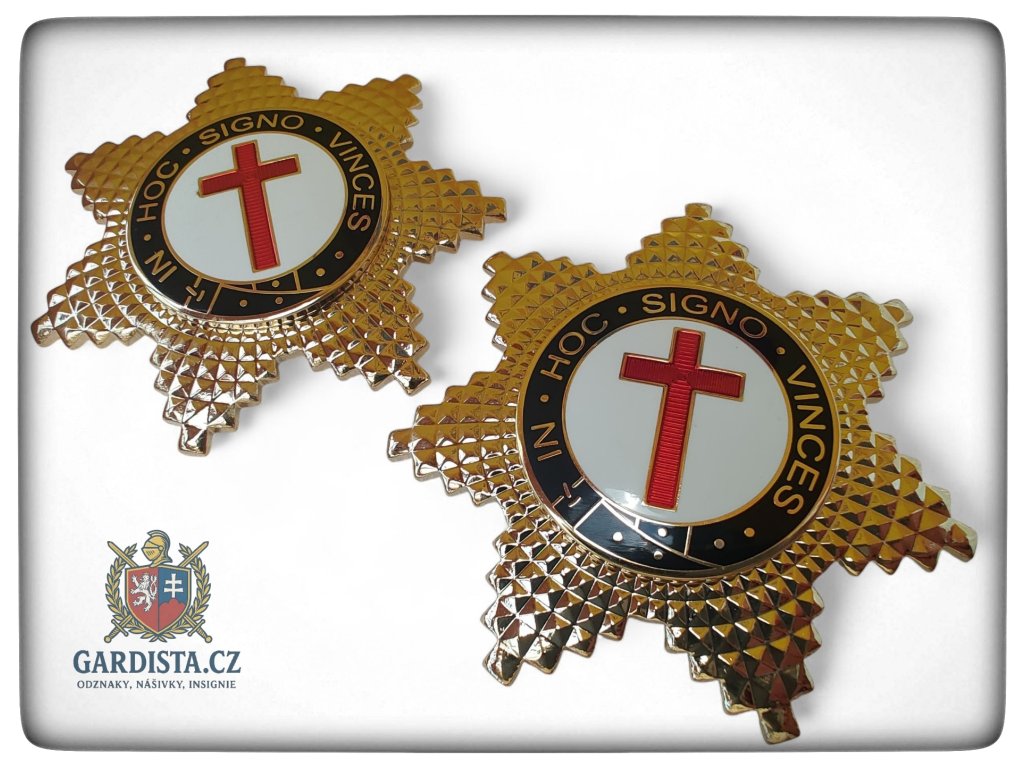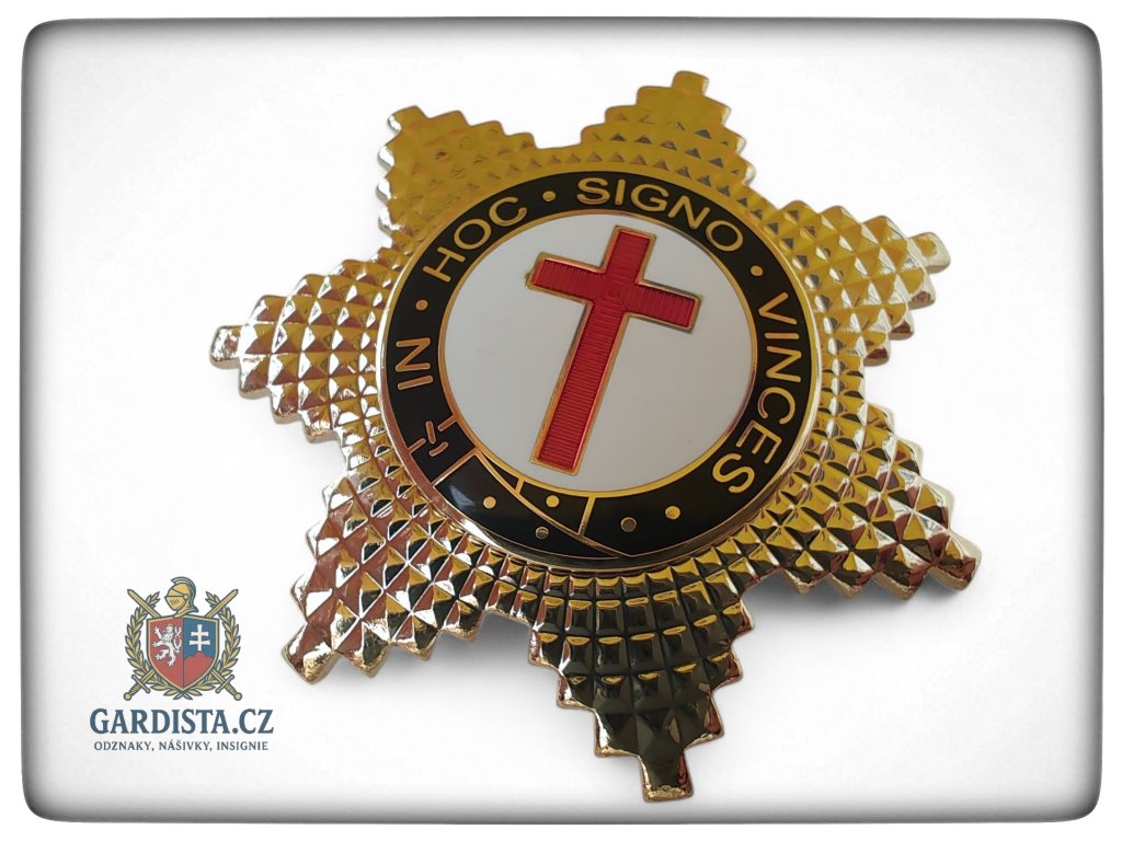 Velká Hvězda Řádu templářských rytířů, vícestranný odznak s hroty ve tvaru pyramidy s výrazným červeným templářským křížem na bílém smaltovaném pozadí. Rozměry cca. 65 x 65 mm.