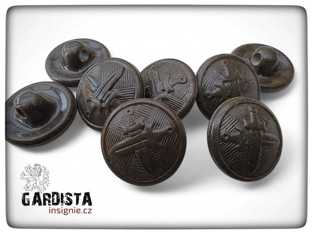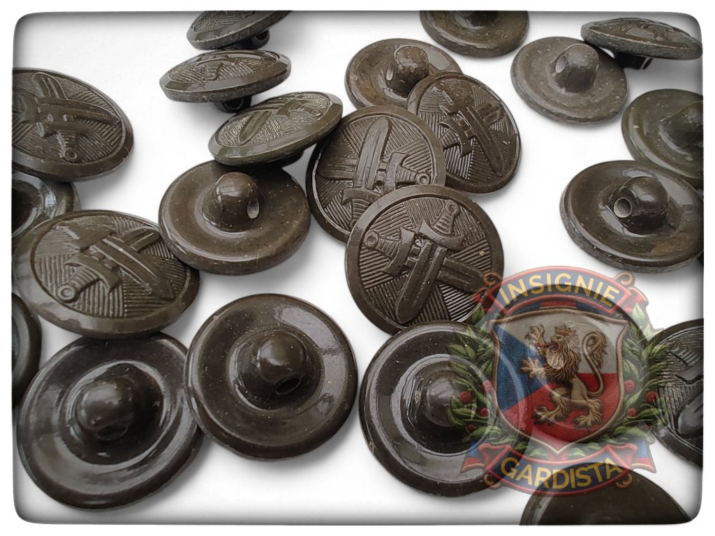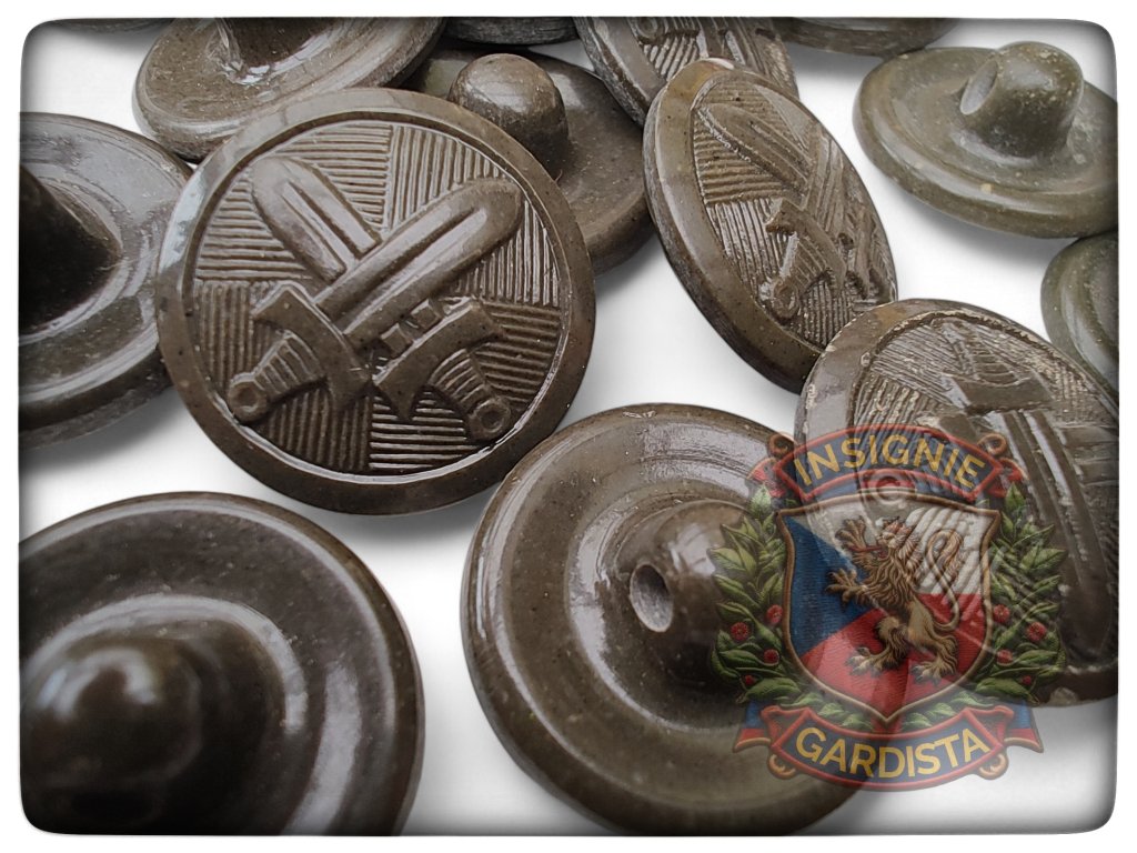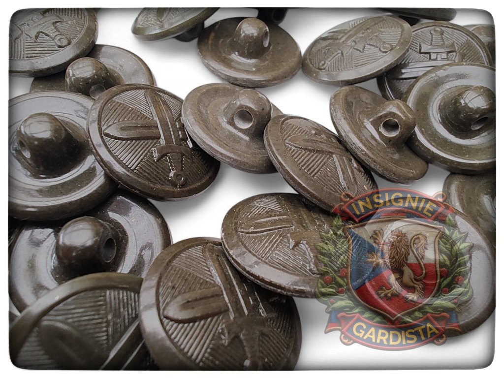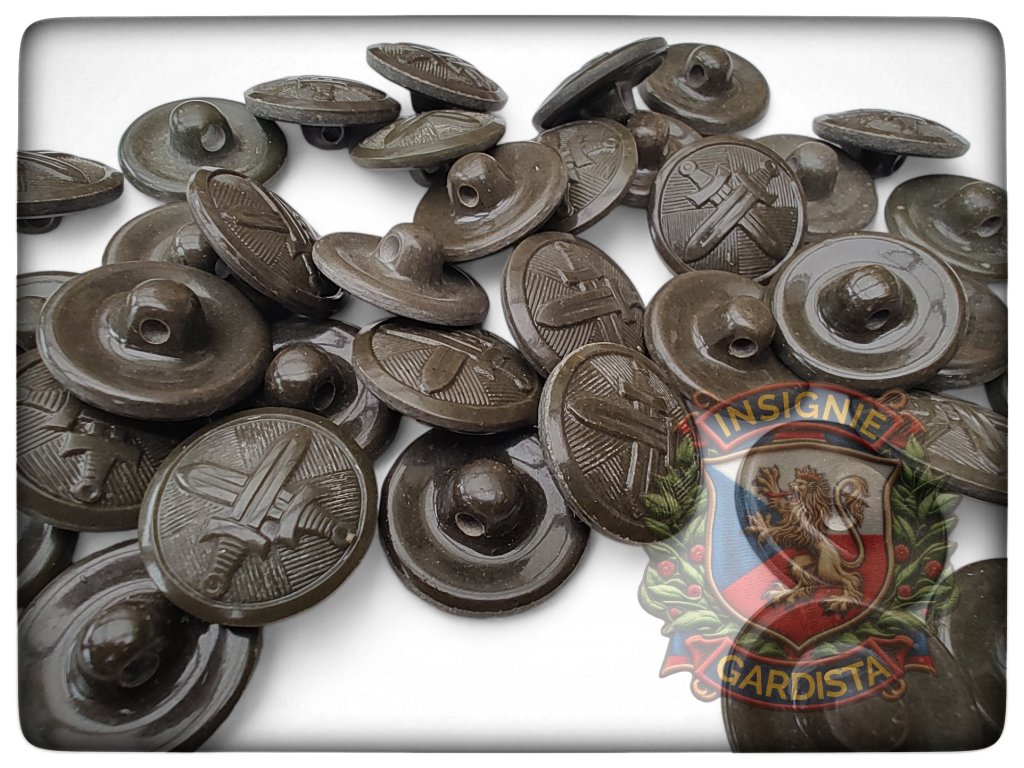 Plastový uniformní knoflík, vzor provedení z období ČSLA - Československé lidové armády. Typ uchycení "s očkem".Barevné provedení: zelené.