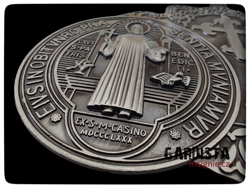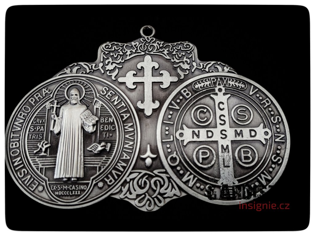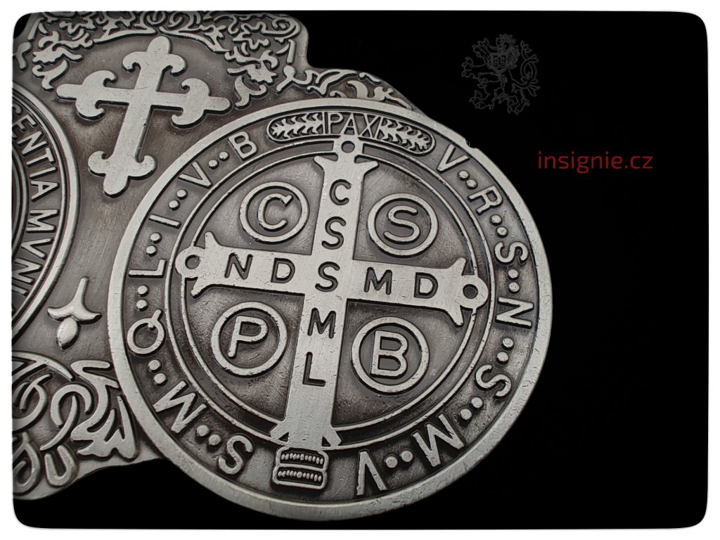 Mezi rameny kříže jsou písmena C S P B: Crux Sancti Patris Benedicti – Kříž svatého otce Benedikta.