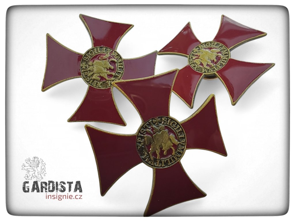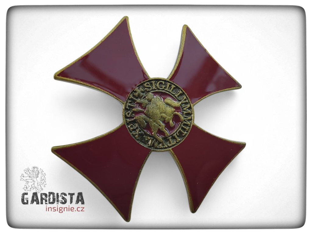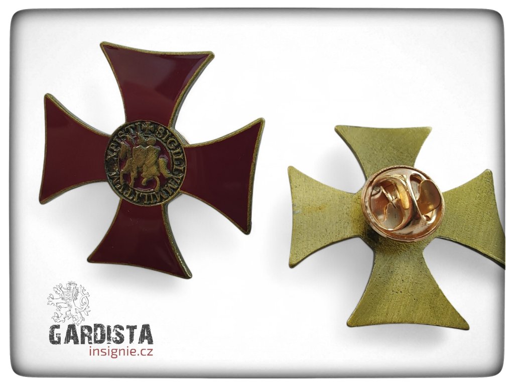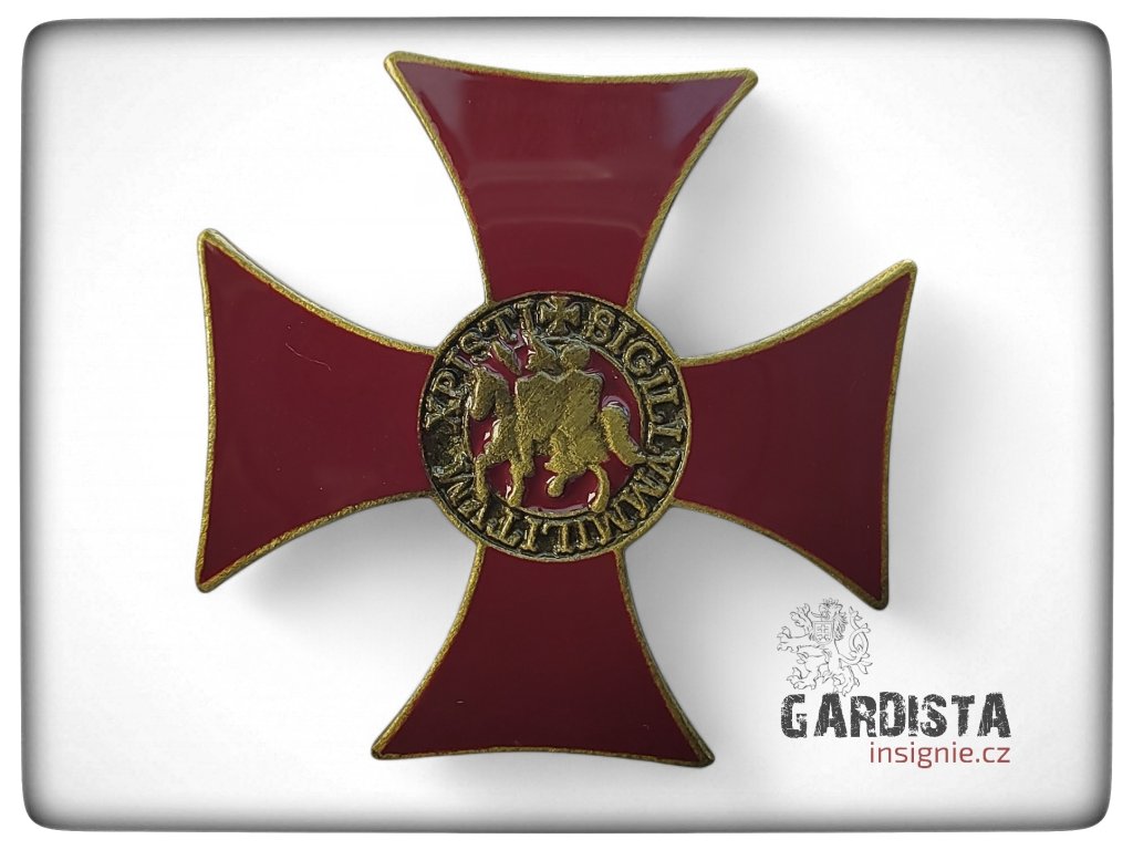 Kovový odznak ve tvaru červeného tlapatého kříže se zlaceným lemováním. Ve středovém medailonu je vyobrazena historická pečeť templářů – motiv dvou jezdců na jednom koni s latinským opisem.