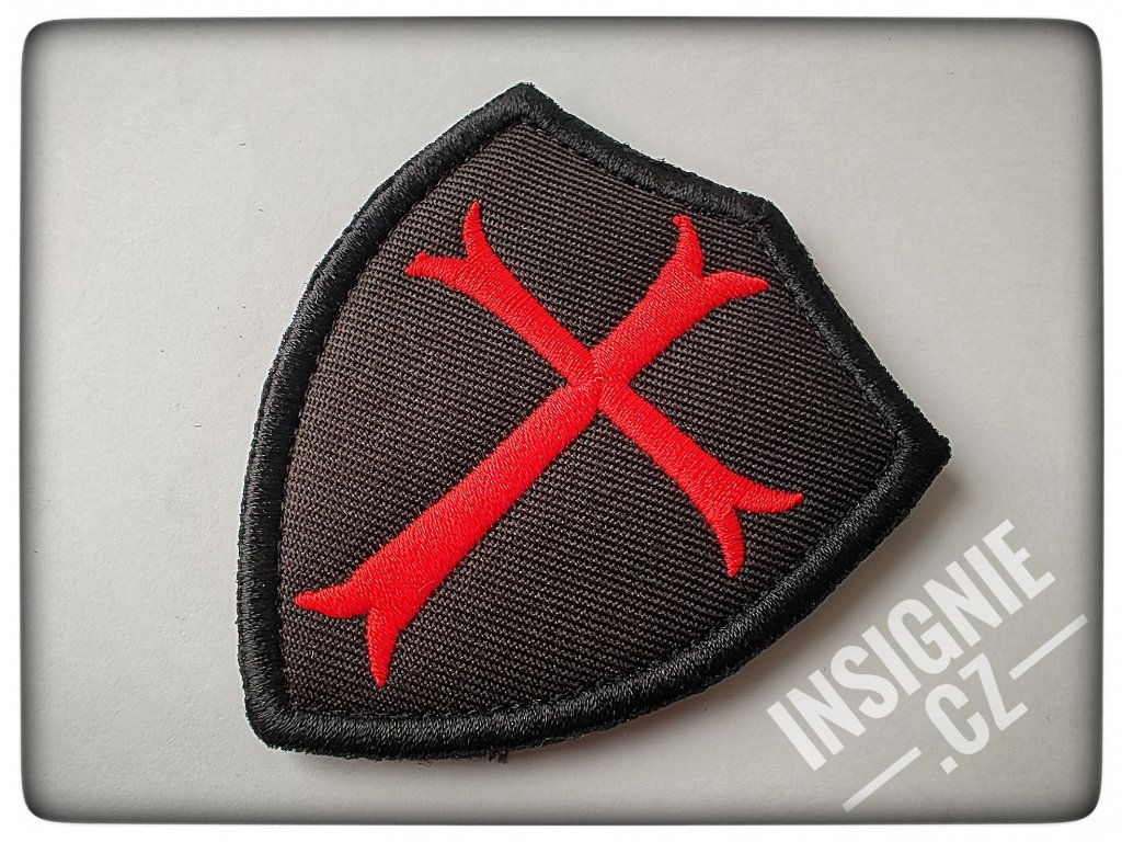 Nášivka ve tvaru štítu s křížem na černém pozadí s lemem