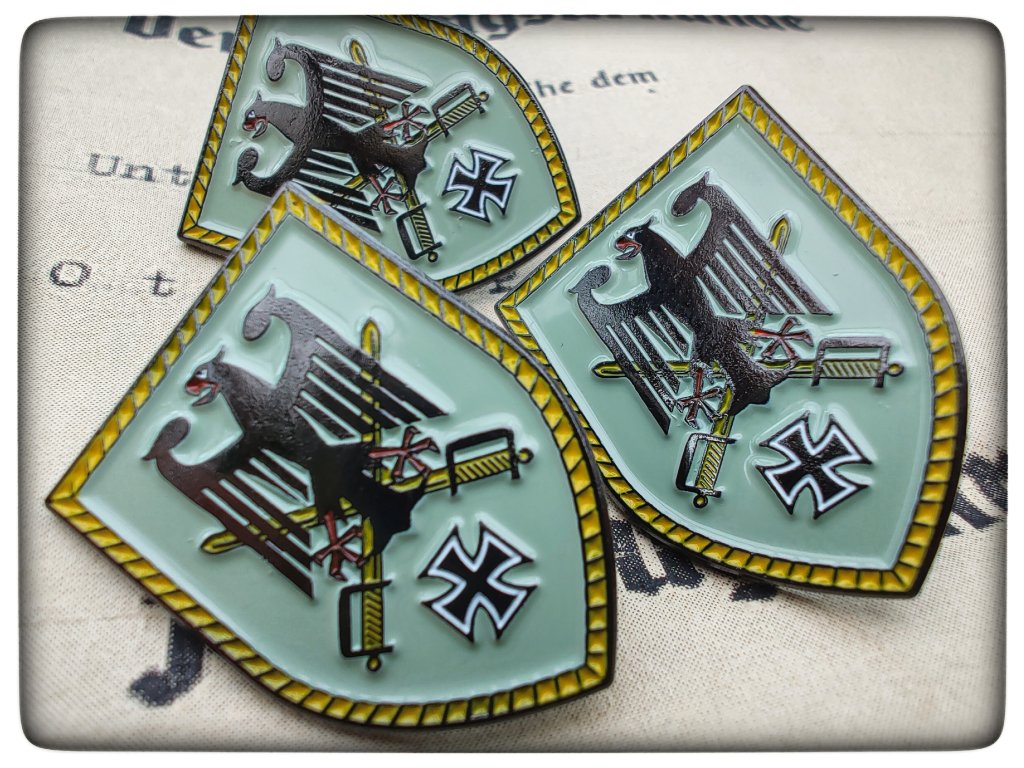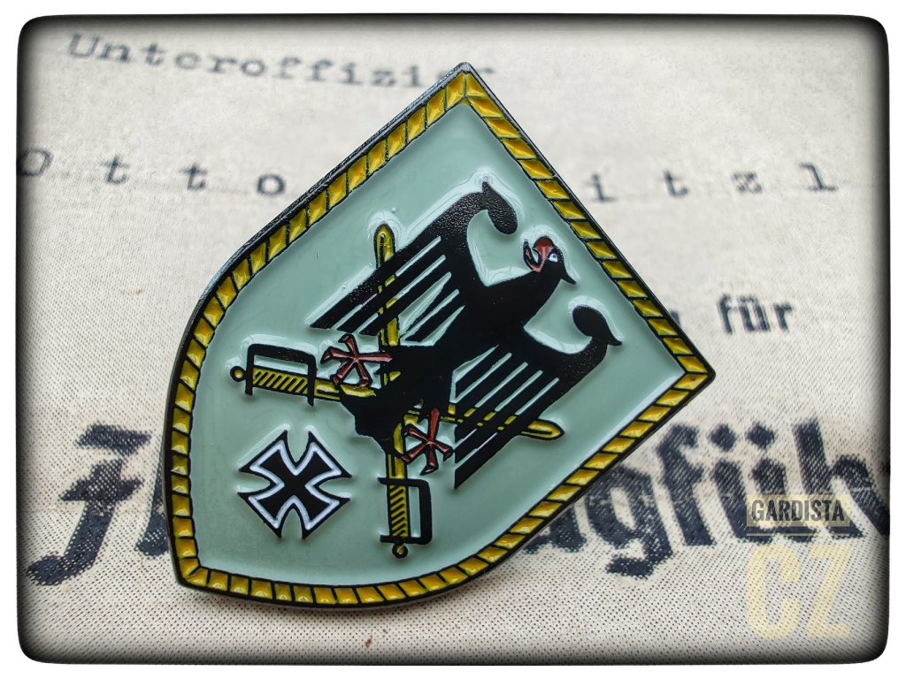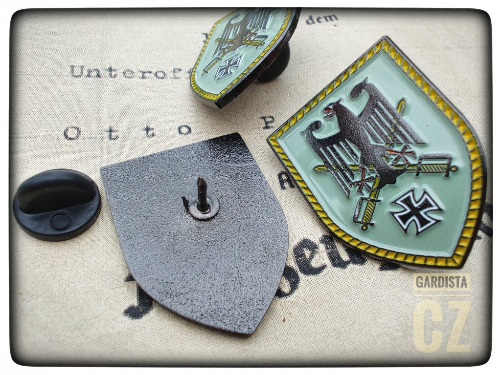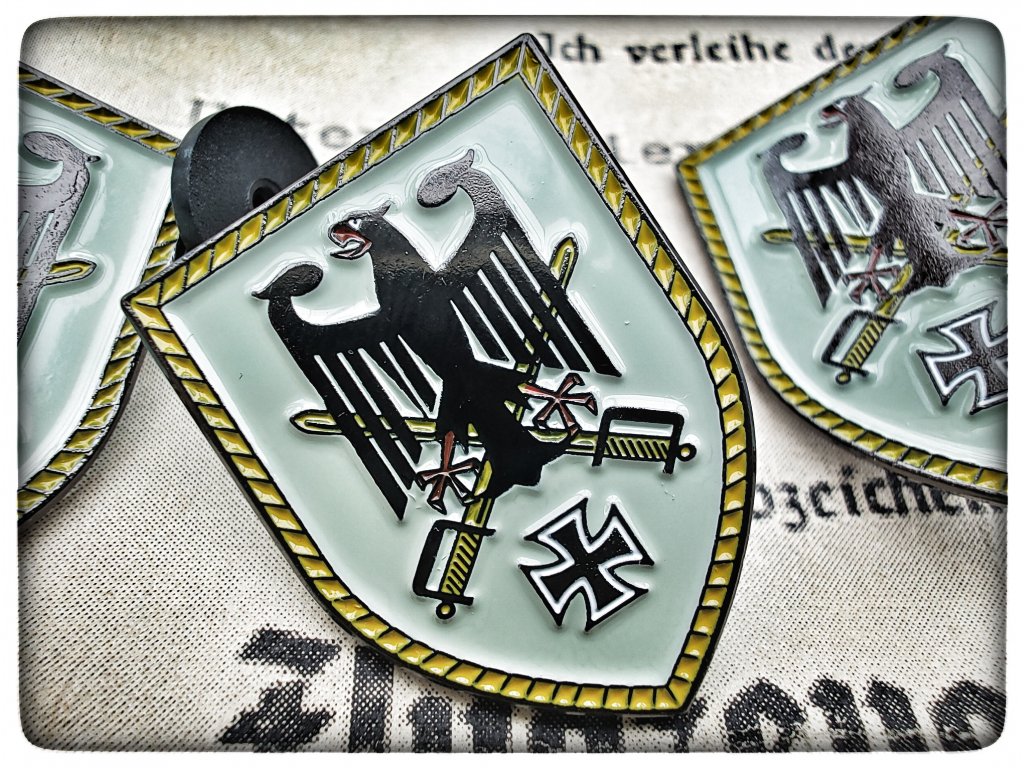 Kovový štítový odznak symbolizující německé ozbrojené síly. ústředním motivem je Říšská orlice (Reichsadler) se dvěma zkříženými meči na pozadí a Železným křížem.