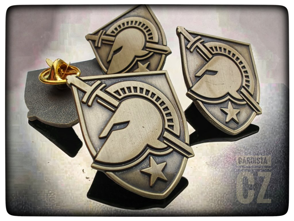 Kovový odznak s tématikou římských vojsk a gladiátorů. Rozměry 23 (š) x 26 mm (v). Zapínání na puzetu.