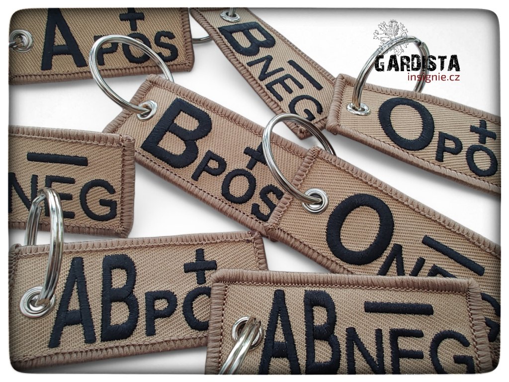 Oboustranně vyšitý přívěsek s krevní skupinou a RH faktorem. Součástí kompletu je i kovový kroužek na připnutí.