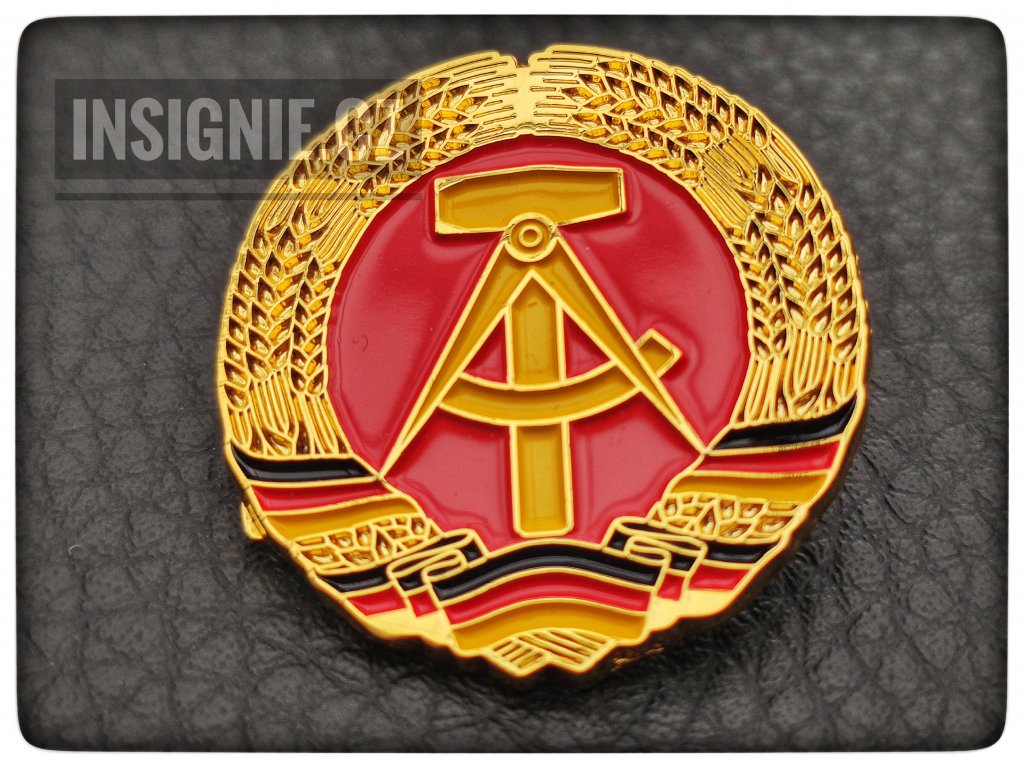 Kulatý kovový odznak se stráním znakem bývalého Východního Německa - Německé demokratické republiky (DDR). Průměr 30 mm. Pěkné, detailní provedení. Zapínání na puzetu.