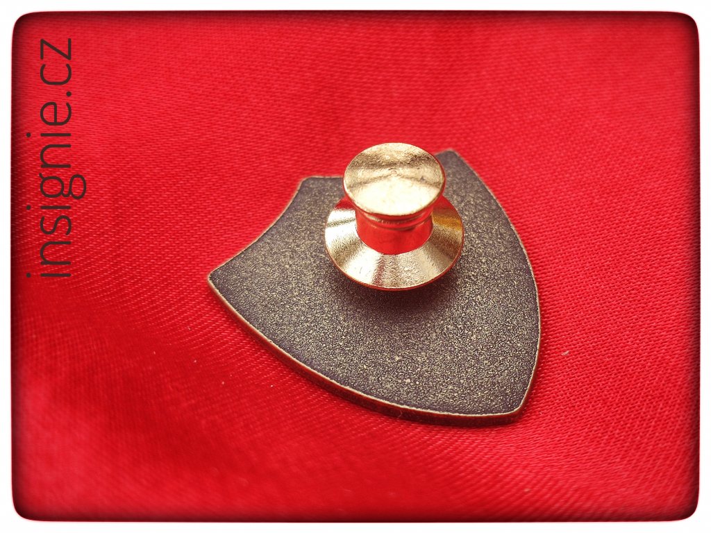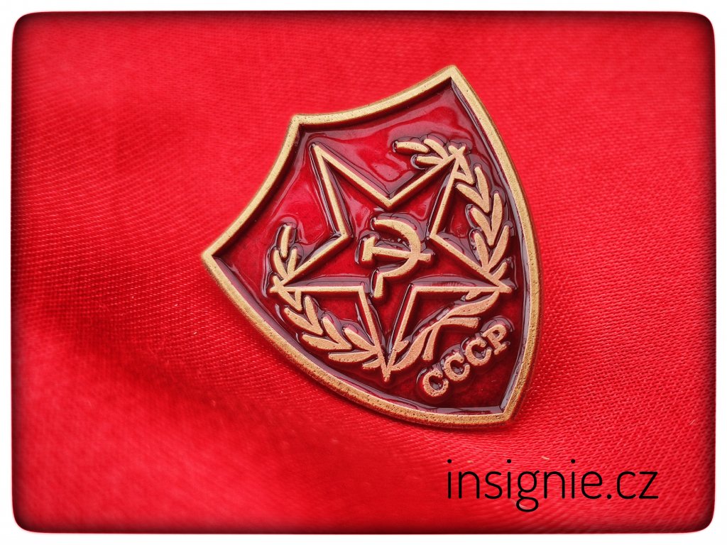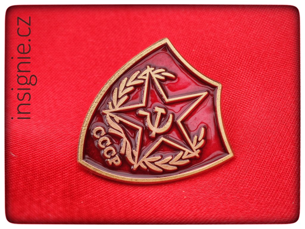 Odznak ve tvaru štítu s insigniemi bývalého Svazu sovětských socialistických republik (SSSR - CCCP). Rozměry 25 mm (výška), 22 mm (šířka).