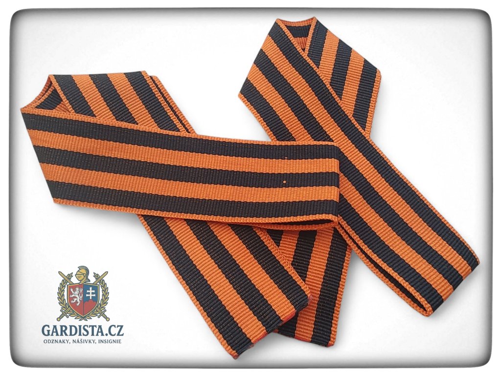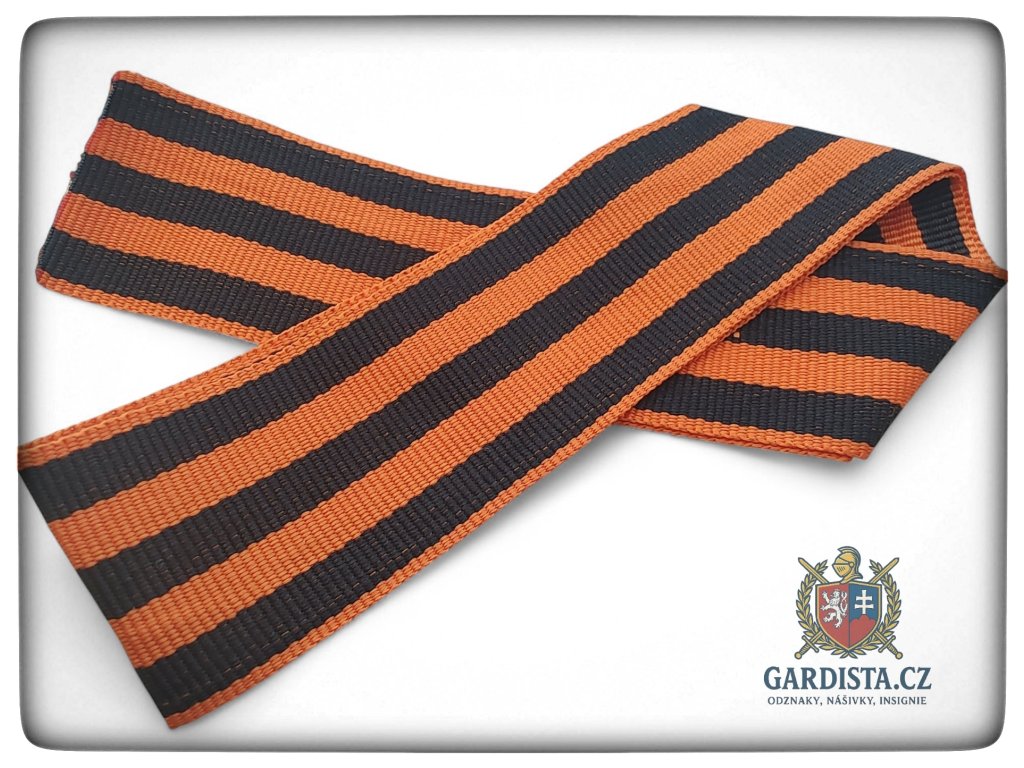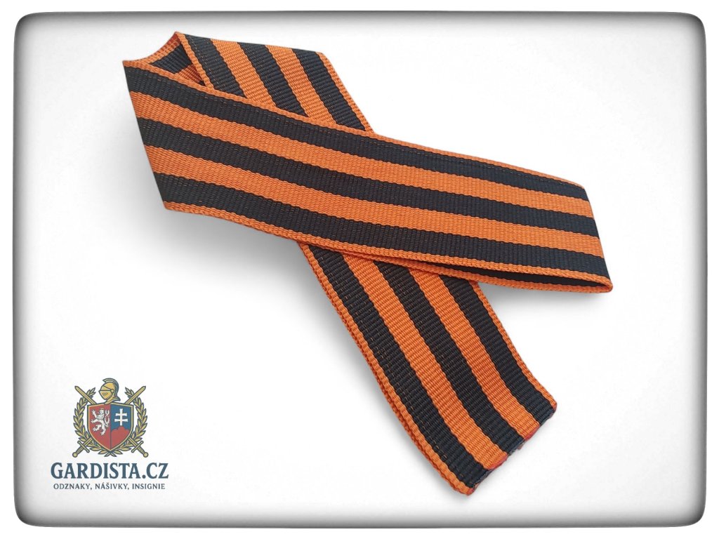 Slavnostní svatojiřská stuha o šířce 35 mm, ve zdvojené skladbě. Výška cca. 13 cm, šířka 6,5 cm.