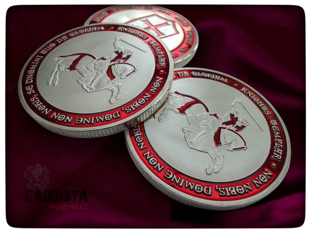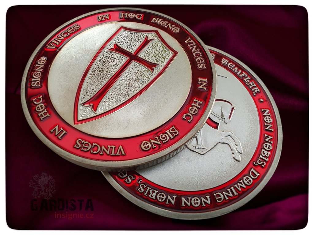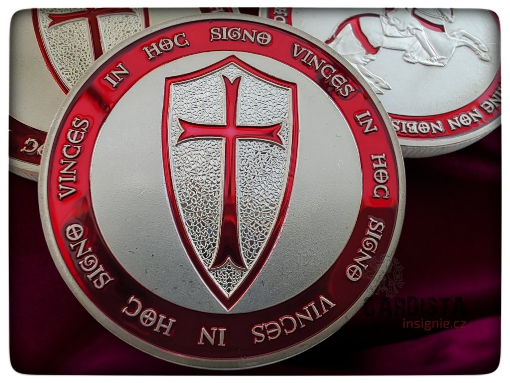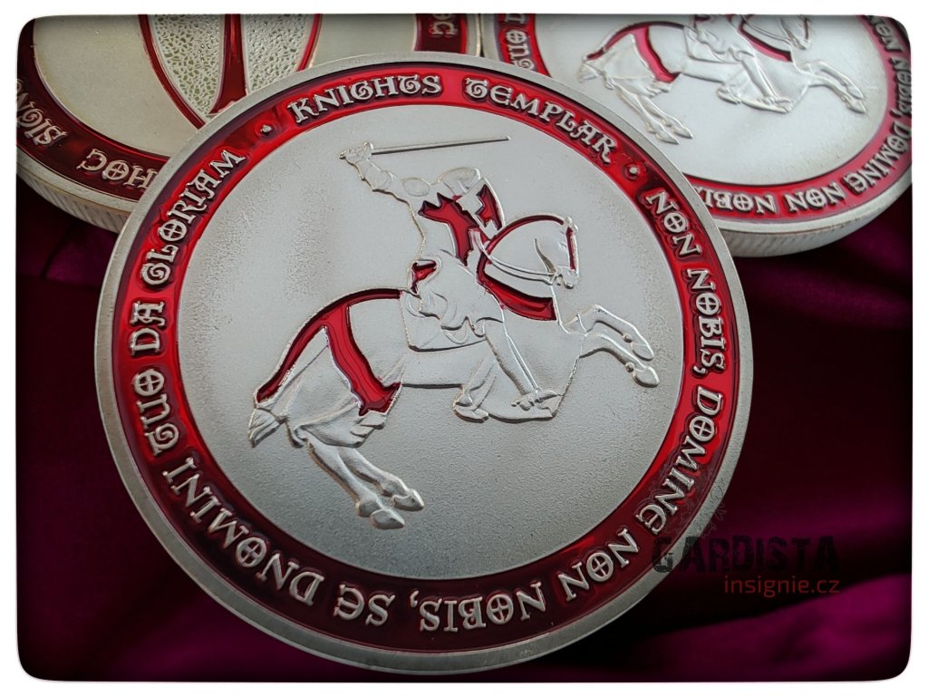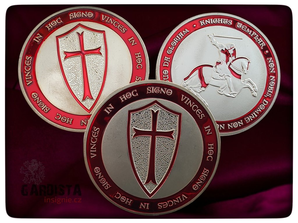Templářská medaile o průměru 40 mm. Na averzní straně štít s křížem, na reverzní templář na koni ve skoku, s taseným mečem.